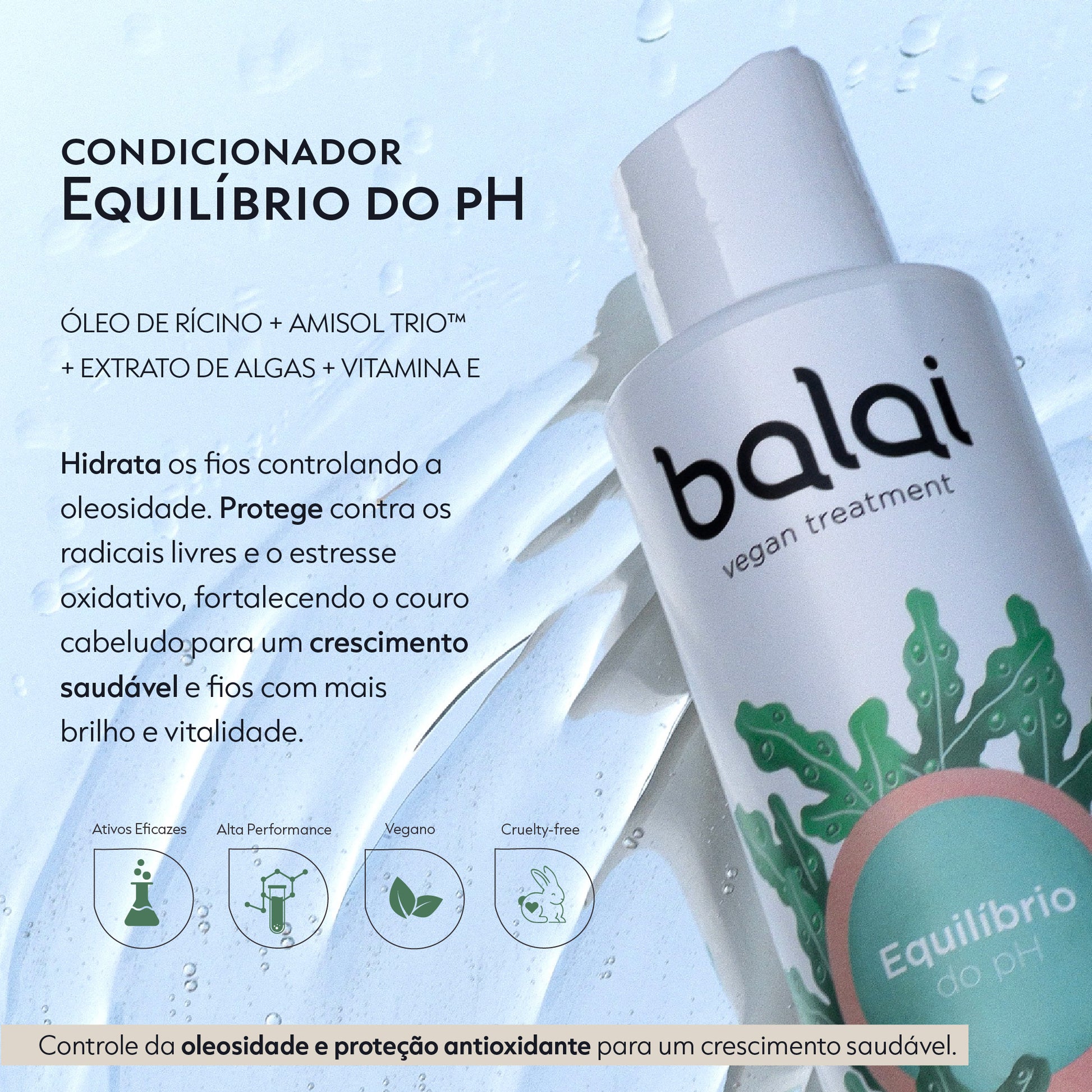 O Condicionador Equilíbrio do pH restaura a saúde e a vitalidade dos fios. Sela as cutículas, realça o brilho natural e protege contra as agressões externas.