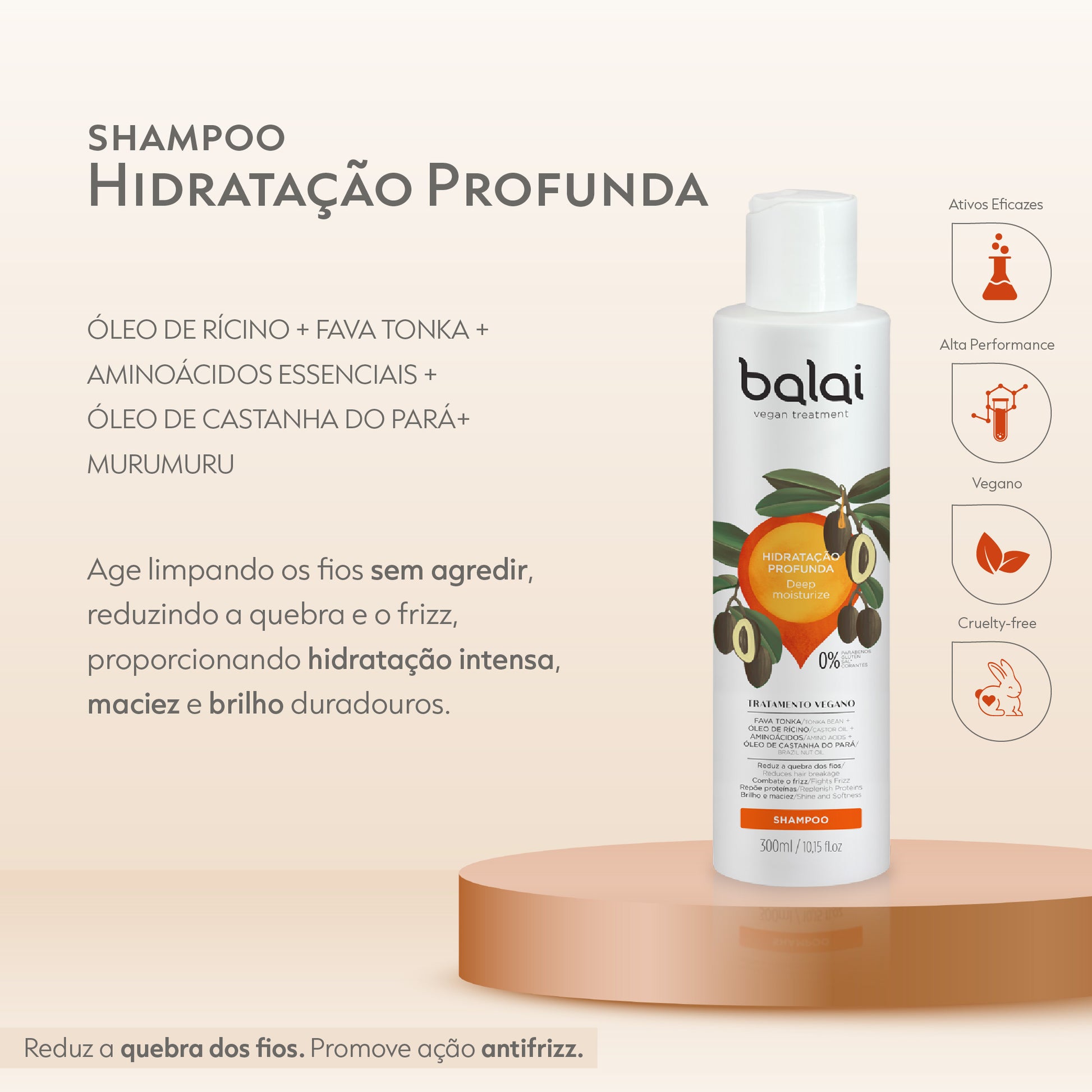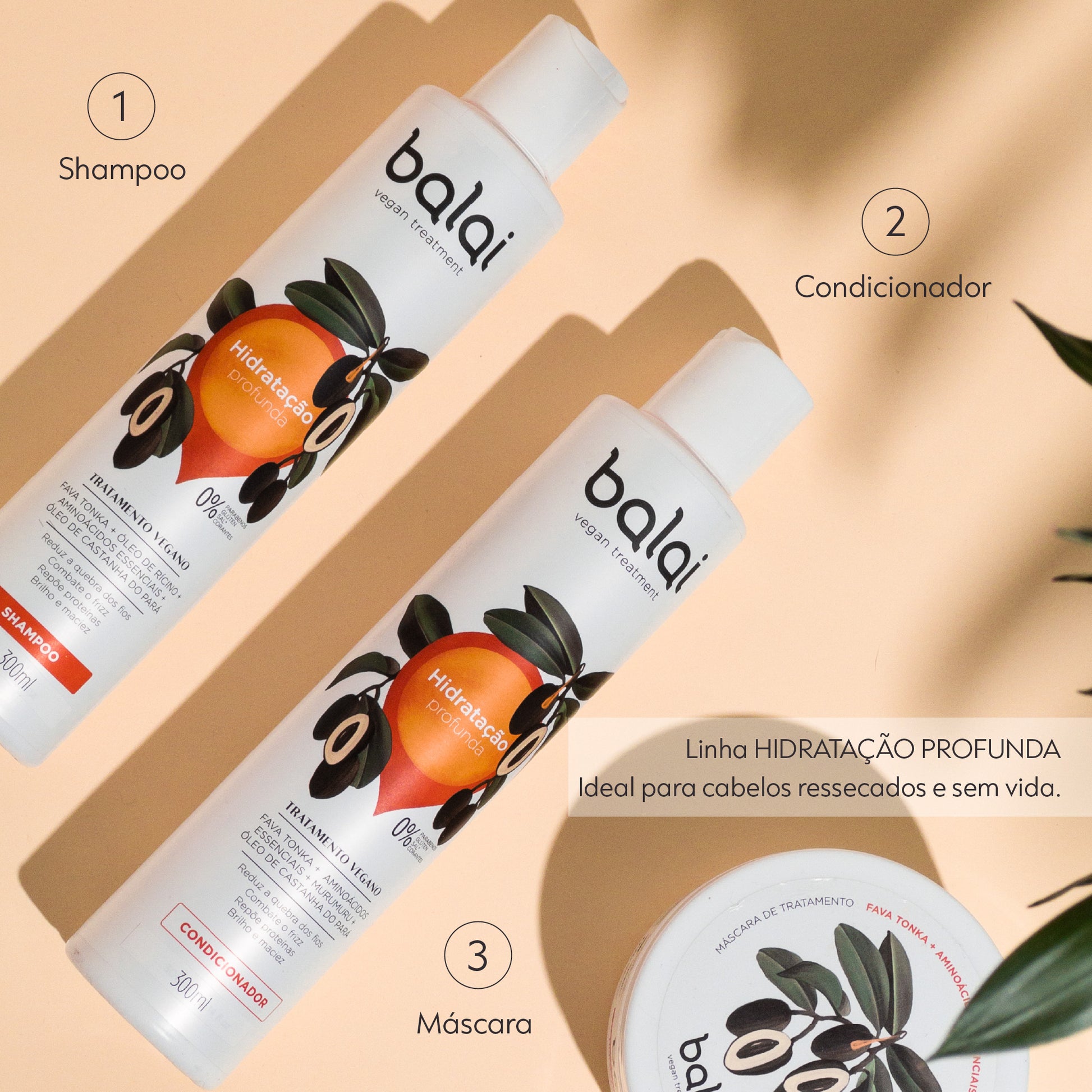 Possui em sua formulação ativos vegetais e farmacêuticos, garantindo um tratamento eficaz, como: Fava Tonka, Óleo de Castanha do Pará, Aminoácidos Essenciais e Óleo de Rícino que conferem hidratação, combatem o frizz e deixam os cabelos mais brilhosos e com aspecto saudável.