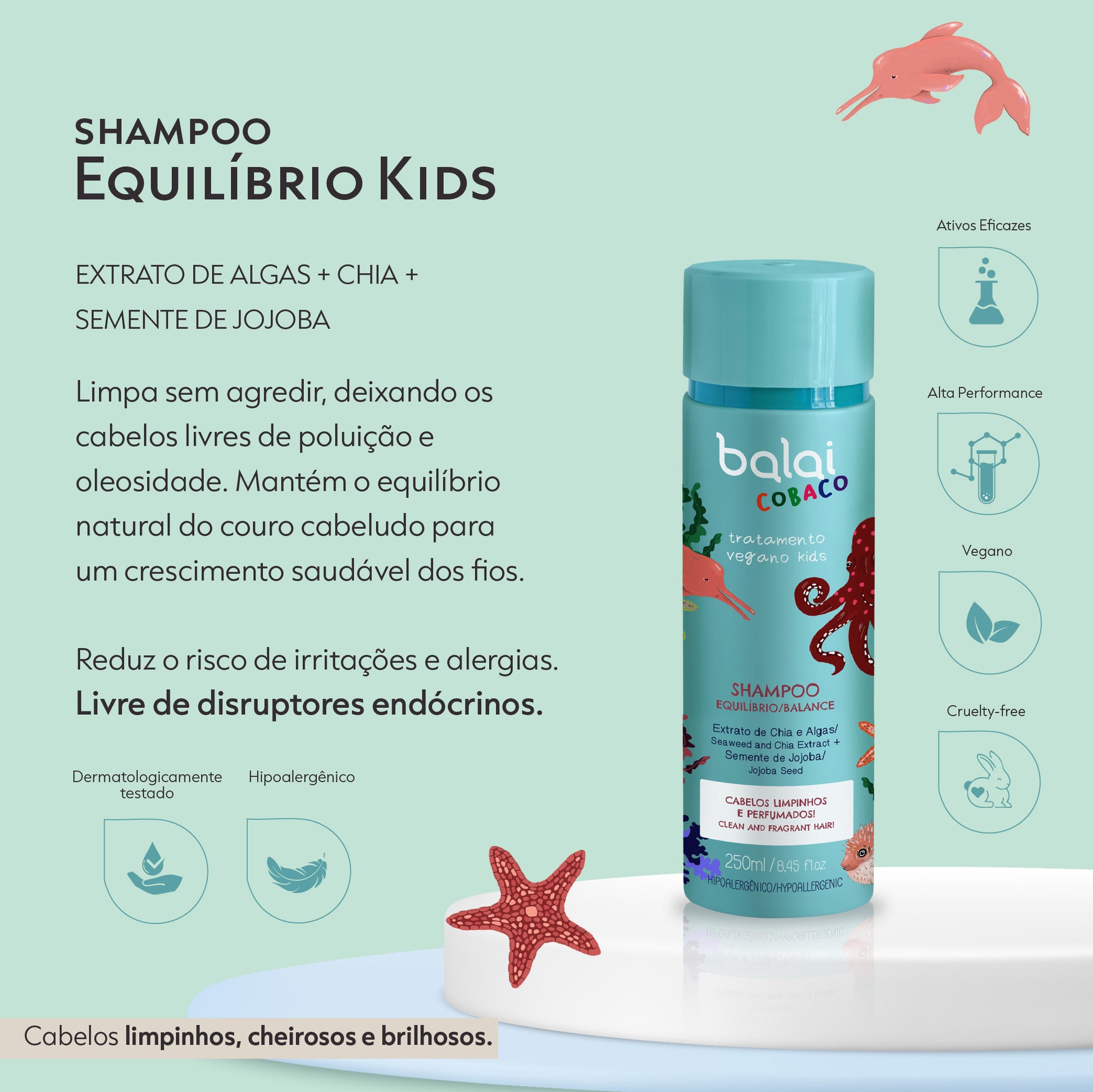 O Shampoo Kids Equilíbrio promove uma limpeza segura para crianças e adolescentes por não conter em sua formulação disruptores endócrinos. Equilibra a oleosidade do couro cabeludo e colabora para o crescimento saudável dos fios.